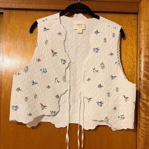 White quilted vest. Features colorful floral embroidery. Sleeveless with tie closure.