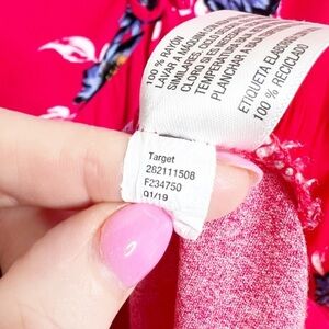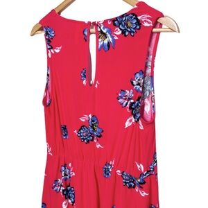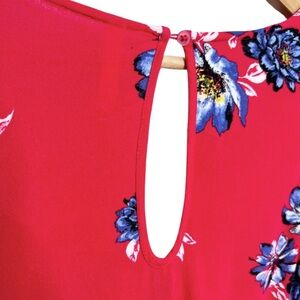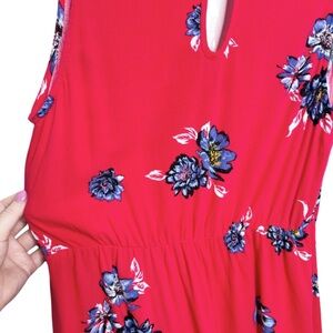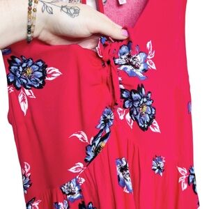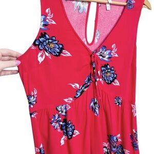 Xhilaration womens red sleeveless dress adorned with a vibrant blue and white floral print. This charming dress features a flattering V-neckline with a decorative tie front detail and a keyhole cutout at the back with a button closure. The empire waist creates a gentle silhouette, and the hemline is slightly asymmetrical. Size M. 100% Rayon. Machine wash cold with like colors. Made in China.