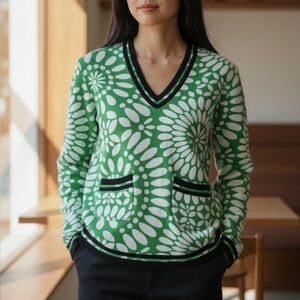 Stylish green and white sweatshirt. Features bold patterns. Comfortable and chic design.