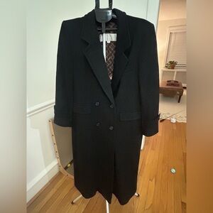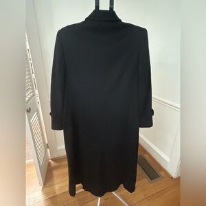 Beautiful Evan Picone long black wool coat in size 12. This is a classic double-breasted silhouette with structured shoulders, notched lapels, and a flattering long line fit.