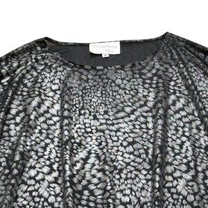 Eye-catching Periphery Too top in a black and silver metallic poly blend with a textured abstract pattern. Features a relaxed oversized silhouette, three-quarter sleeves, and a longer tunic length with a solid black hem panel for contrast. Lightweight with a subtle shimmer that gives it a bold Y2K evening or statement look. Perfect for layering over leggings, trousers, or styled as a standout vintage piece.