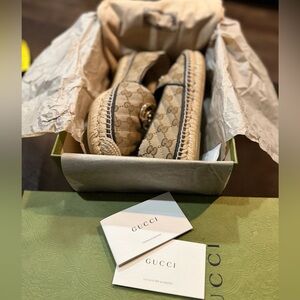 Gucci Tan Espadrille Flats with Gold Emblem
