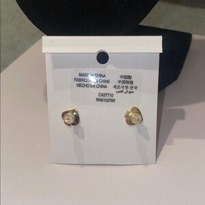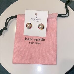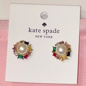 Chic earrings with a central pearl. Surrounded by vibrant gemstones. Gold-tone setting. With dust bag included.
