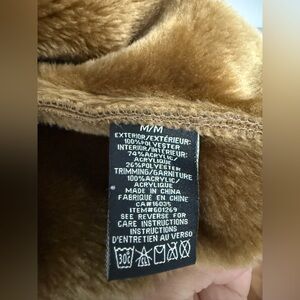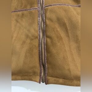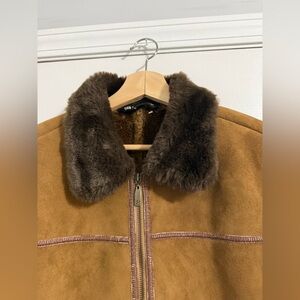 Elevate your wardrobe with this elegant tan teddy jacket, featuring luxurious faux fur trim for added warmth and style. PTP 22.5” LENGTH 28”