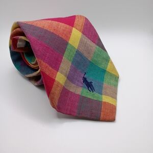 This is a Vintage Madras Plaid pointed Men's Necktie by Polo Ralph Lauren featuring the Signature Pony Logo. Spring and Summer pastel colors. Hand Made in the USA of 100% Cotton imported fabric. Excellent condition, no stains tears or holes noted, gently worn with creases as expected with a previously owned garment.