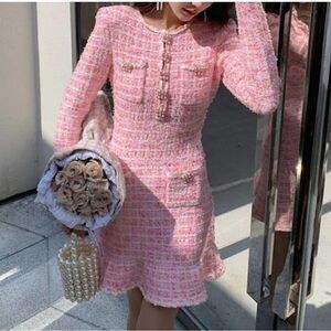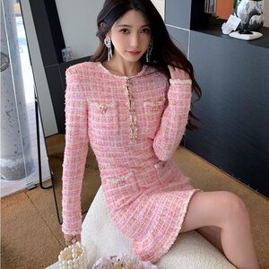 This chic sheath dress features a crew neck and long sleeves, making it ideal for work or cocktail events. The pink and white color palette adds a sophisticated touch to its buttoned design.
