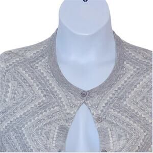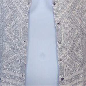 Add cozy sophistication to your wardrobe with this Bass Medallion Print Cardigan, size Medium. Featuring a soft grey knit with white accents and decorative solid panels on the front, arms, back, and hemline, this button-front sweater combines timeless style with all-day comfort. Crafted from a soft blend of 55% cotton, 25% polyester, and 20% viscose, it’s perfect for business casual, office wear, or layering over your favorite tops. Excellent pre-owned condition from a smoke-free home.