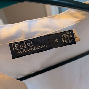 Polo by Ralph Lauren white dress shirt. 3/4 button front. Collarless. Blouson sleeve. Boxy fit. Unlined. Garment is in good condition with no flaws.