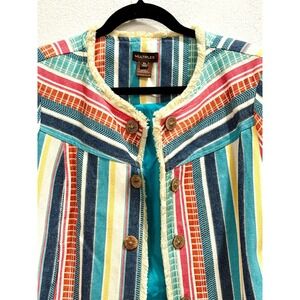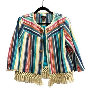Women's Striped Fringe Jacket Petite Size Large Artsy Boho Coastal Lagenlook