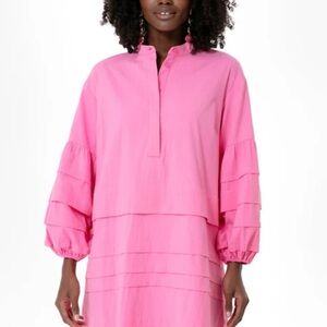 Bright pink mini dress with stylish puff sleeves. Perfect for a chic look.