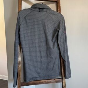 Stylish Nike pullover with a quarter-zip design. Features heather gray fabric and neon pink accents.