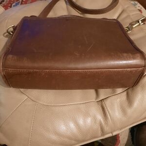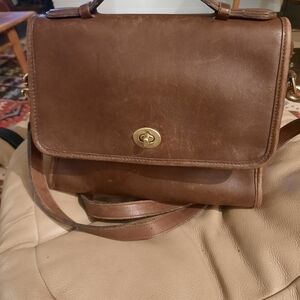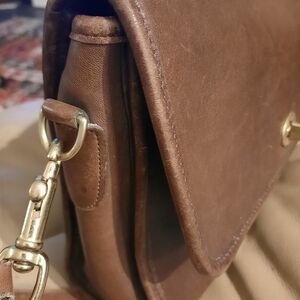 Sophisticated brown leather bag by Coach. Features elegant gold hardware. Ideal for everyday use.