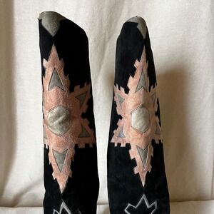 Striking handmade Italian suede boots featuring bold Southwestern inspired leather appliqué in soft blush and sage tones. Lightweight with lug rubber soles and felted lining interior. Rare statement pair from Susan Bennis Warren Edwards — sculptural, artful, and highly collectible. No size marked; fits approximately women's 6.5–7 Narrow fit based on measurements.