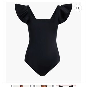 Chic black swimsuit with stylish ruffle sleeves. Ideal for beach outings. Worn once. Amazing material. I lost weight so it is too big now.