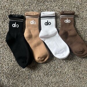 Stylish and comfortable ALO Yoga socks. Perfect for athletic wear. Includes black, tan, white, and brown colors.