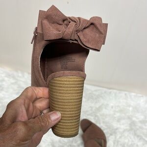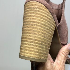 These chic heels feature a suede-like material with cut-out details and a chunky wooden block heel, perfect for transitional weather. See all photos as they are part of description