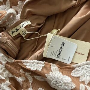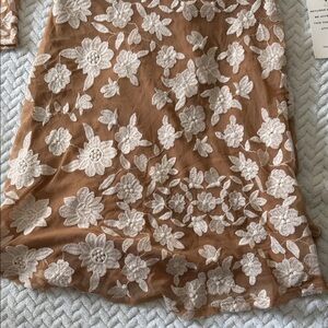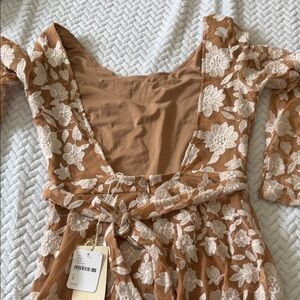 Chic floral mini dress with a tan base and white floral pattern. Perfect for stylish outings.