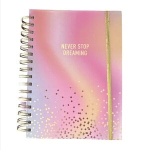 Vibrant pink and gold spiral notebook with 'Never Stop Dreaming' cover.