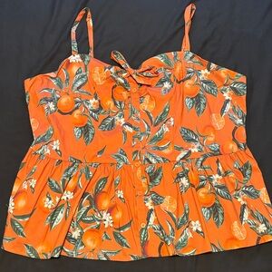 Vibrant orange sweetheart neck line peplum top with citrus and leaf design. Features adjustable straps. Ideal for casual summer wear.