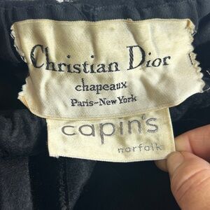 This beautiful beret is probably dating back to the 1960s. It has an elasticized interior band. Tag shows that it was sold by Capin’s Norfolk. There are some flaws that had been shown on the pictures. There are some stitches missing inside to the left side of the tag. This can be seen on pictures (inside/outside). This piece was most likely part of Dior’s millinery line produced for the North American market.