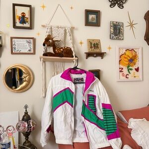 Stylish Vintage bomber jacket. Features bold pink and green accents. Perfect for a retro look.