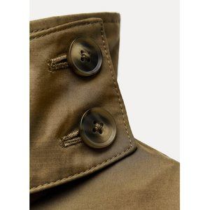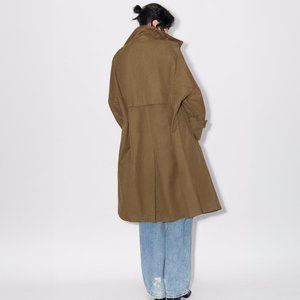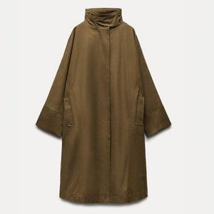 Stylish olive trench coat by Zara. Features button closure and high collar. Perfect for layering.
