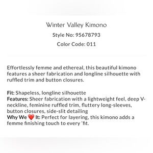 Boho, ethereal kimono which looks great open, buttoned or belted. Pretty over a slip dress or jeans.