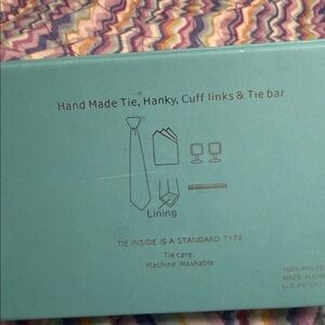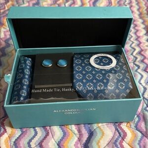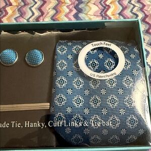 Elegant blue tie set with intricate pattern. Includes tie, pocket square, cufflinks, and tie clip. Ideal for formal events.