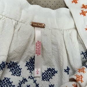 Free People Bali Main Squeeze Lemon Dress Size Large with lemon cross-stitch design. It has the sweetest ruffled-adorned design. This embroidered mini dress features a square neckline and side pockets.