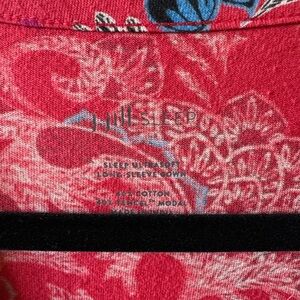 Would fit Medium and defintely so pretty can be worn as dress. Great lounging around home outfit. Sofy and comyfy. Vibrant pink long sleeve top with a floral pattern in blue and white. Features a V-neckline with buttons.