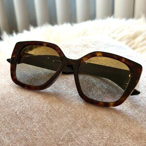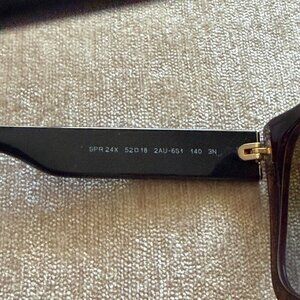 Authentic Prada Milano SPR 24X sunglasses featuring a bold square frame in brown tortoise with black arms and gold hinge detailing. Classic oversized silhouette with Prada Milano logo at temples. No Case.
