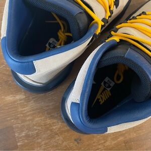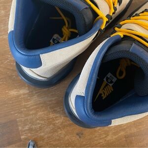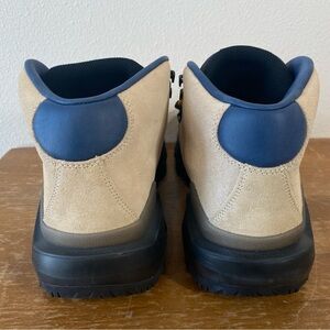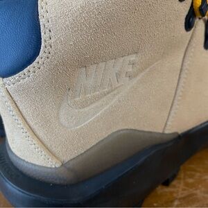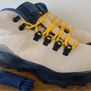 Nike boots in sand and navy. Bright yellow laces. Rugged sole for traction.