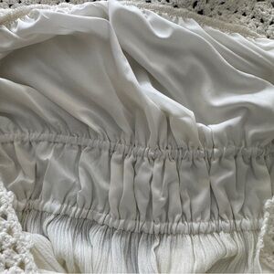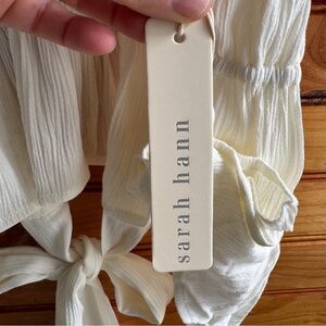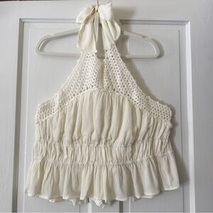Beautiful new-with-tags Sarah Hann for Anthropologie halter top in soft ivory. Features intricate crochet detailing at the neckline and waist, an adjustable tie-back closure (fully open back with waist tie — not a pullover), and a flattering ruched peplum hem. Lightweight lined woven body with feminine, boho appeal.