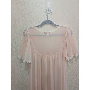 Vintage New with Tags Deadstock Miss Elaine Silk Essesnce full length nightgown. Sheer light pink silky fabric with lace trim on the sweatheart neckline and sleeves. Flower, lace and ribbon details of the chest. Perfect lightweight nightgown for warmer temperatures, wedding lingerie and traditional trad wife.