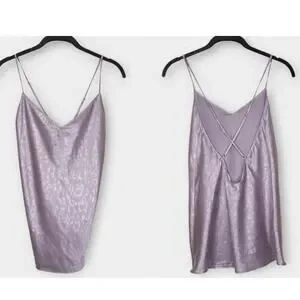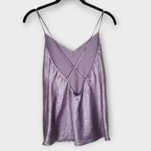 Shimmery lavender satin cami with tonal leopard print and spaghetti straps. Features a deep V front and open criss-cross back. Slightly flared hem.