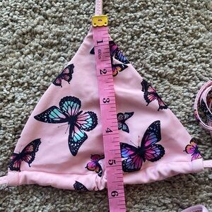 Pink bikini with vibrant butterfly print. Triangle top and cheeky bottoms. Perfect for a stylish beach day.