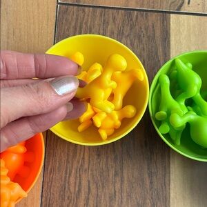 Engage your child with these vibrant dinosaur sorting cups. Perfect for color recognition and fine motor skills development. Includes red, orange, yellow, green, blue, and purple cups filled with matching dinosaurs. Adult supervision required. Recommended for ages over 3.