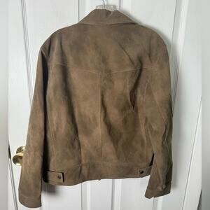 Features: Vegan suede fabrication, pointed collar, button-front closure, 4 flap pockets, button hem and cuffs