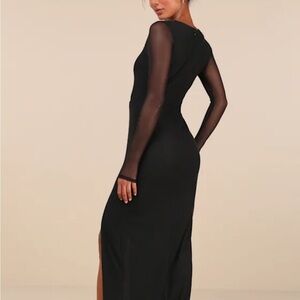 Elegant black dress with sheer long sleeves. Features a stylish high slit. Ideal for evening events.