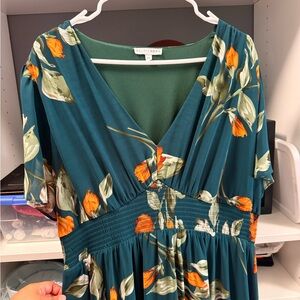 Embrace elegance with this stunning floral maxi dress. Featuring a beautiful green base adorned with vibrant orange flowers, this dress is perfect for any occasion. Enjoy a flattering fit and stylish design.