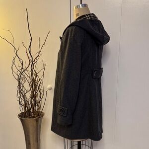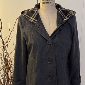 Stay stylish and warm with this classic black hooded pea coat. Its timeless design makes it a versatile addition to any wardrobe.