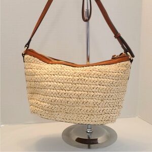 Stylish woven shoulder bag in brown and cream. Perfect for casual outings. Durable and chic design.
