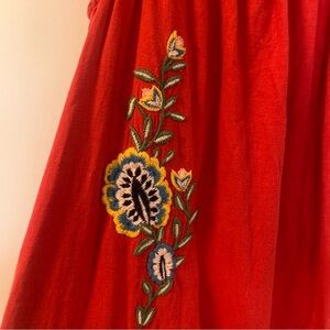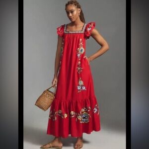 Farm Rio x Anthropologie embroidered maxi dress. Designed with a flattering square neckline, charming flutter sleeves, and vibrant floral embroidery, this eye-catching red dress brings effortless bohemian elegance to any occasion. Made from a breathable linen-viscose blend, it features easy pullover styling and a relaxed silhouette with tiered detailing for added flow. Perfect for vacation, summer events, or brunch with friends.