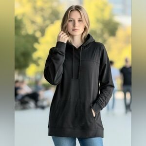 Experience comfort and style with this elegant black hoodie, perfect for any casual occasion.