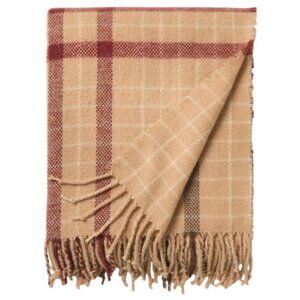 Soft and cozy throw blanket featuring a tan and red plaid design with fringe detailing. Machine washable for easy care, perfect for adding warmth and style.