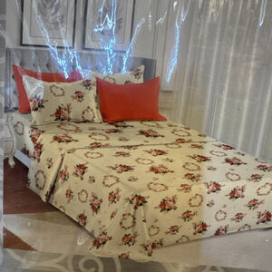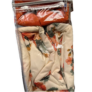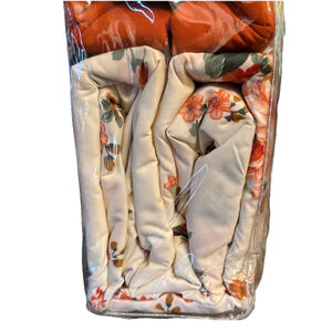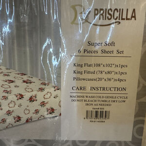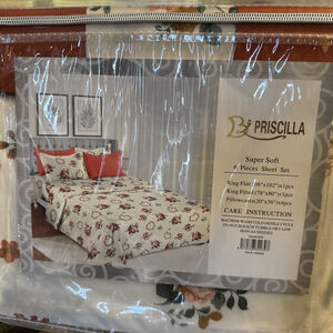 The Priscilla Super Soft 6 Pieces Sheet Set is a luxurious addition to any bedroom, featuring a beautiful floral pattern in burnt orange, cream, and green colors. Made from a blend of bamboo and 100% cotton, these sheets offer a soft and cozy feel. The set includes a king flat sheet, king fitted sheet, and pillowcases, all with a deep fitted design for a comfortable night's sleep. Easy to care for with machine wash and tumble dry instructions, this sheet set exudes an art deco style with a floral theme, perfect for adults looking to add a touch of elegance to their bedroom decor. King flat flat (108” x 102”), King