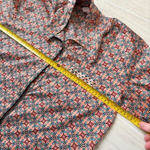 Geometric patterned pajama top. Features orange and blue design. Comfortable and stylish.