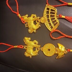 You will receive 1 of these assorted gold and red hanging ornaments with tassels. Perfect for festive decor or as a bag charm. The horse and charm are unbreakable plastic.