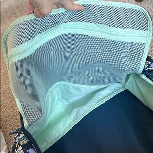 Gently used but very clean. Has some rubbing on the corners of the bottom as pictured. Please see all pics. Great travel bag and beautiful print! All zippers work like new. Stock photos for reference of product only.