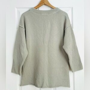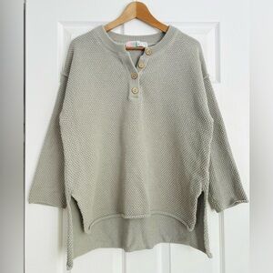 Scoop henley neckline. Contrast button detailing. Dropped raglan sleeves. Side slits.